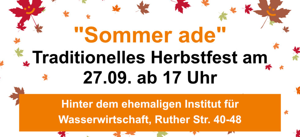 WiR laden euch wieder herzlich ein, einen gemütlichen Herbstabend in fröhlicher Gesellschaft beim traditionellen Herbstfest „Sommer adé“ zu verbringen. Wann: am 27.09.2025 ab 17 UhrWo: Hinter dem ehemaligen Institut für Wasserwirtschaft, Ruther Str. 40-48...