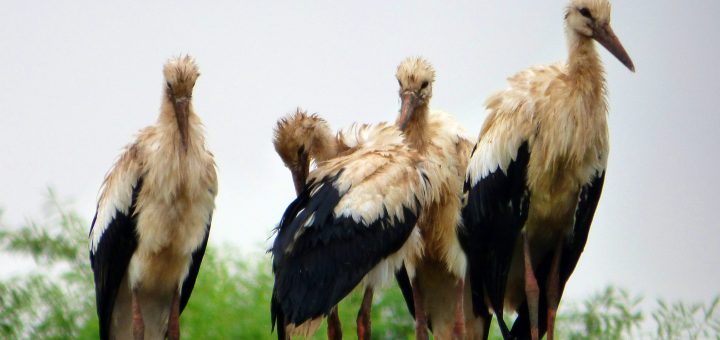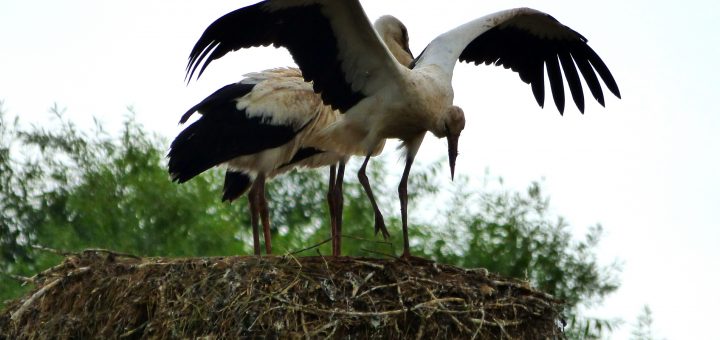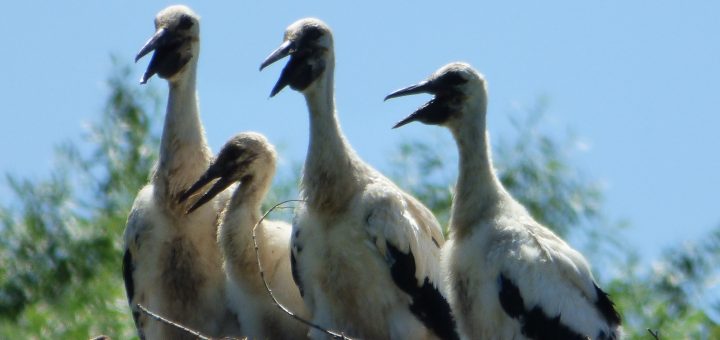 Bald könnte es eng werden auf dem Nest, da die vier jungen Störche weiter gut gewachsen sind. Die Eltern sind jetzt ständig damit beschäftigt Futter heranzuschaffen, oft auch direkt auf der Wiese am Nest.