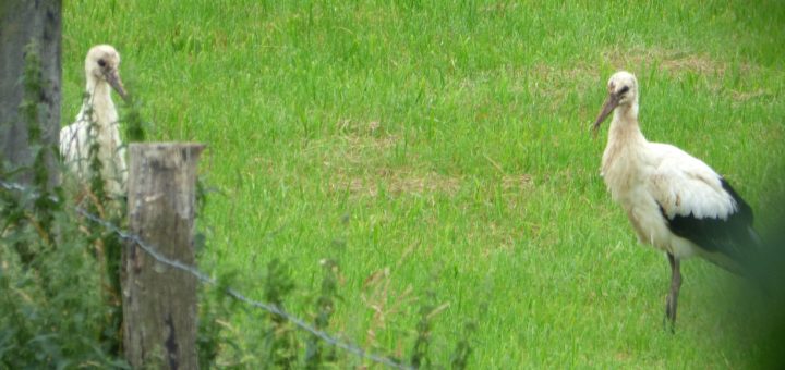 Seit heute sind alle vier Jungstörche flügge. Während die vier Jungen zu zweit auf der Wiese unterwegs sind und nach Futter suchen, hält sich ein Elternstorch auch auf der Wiese und der andere auf dem Dach des Hauses...